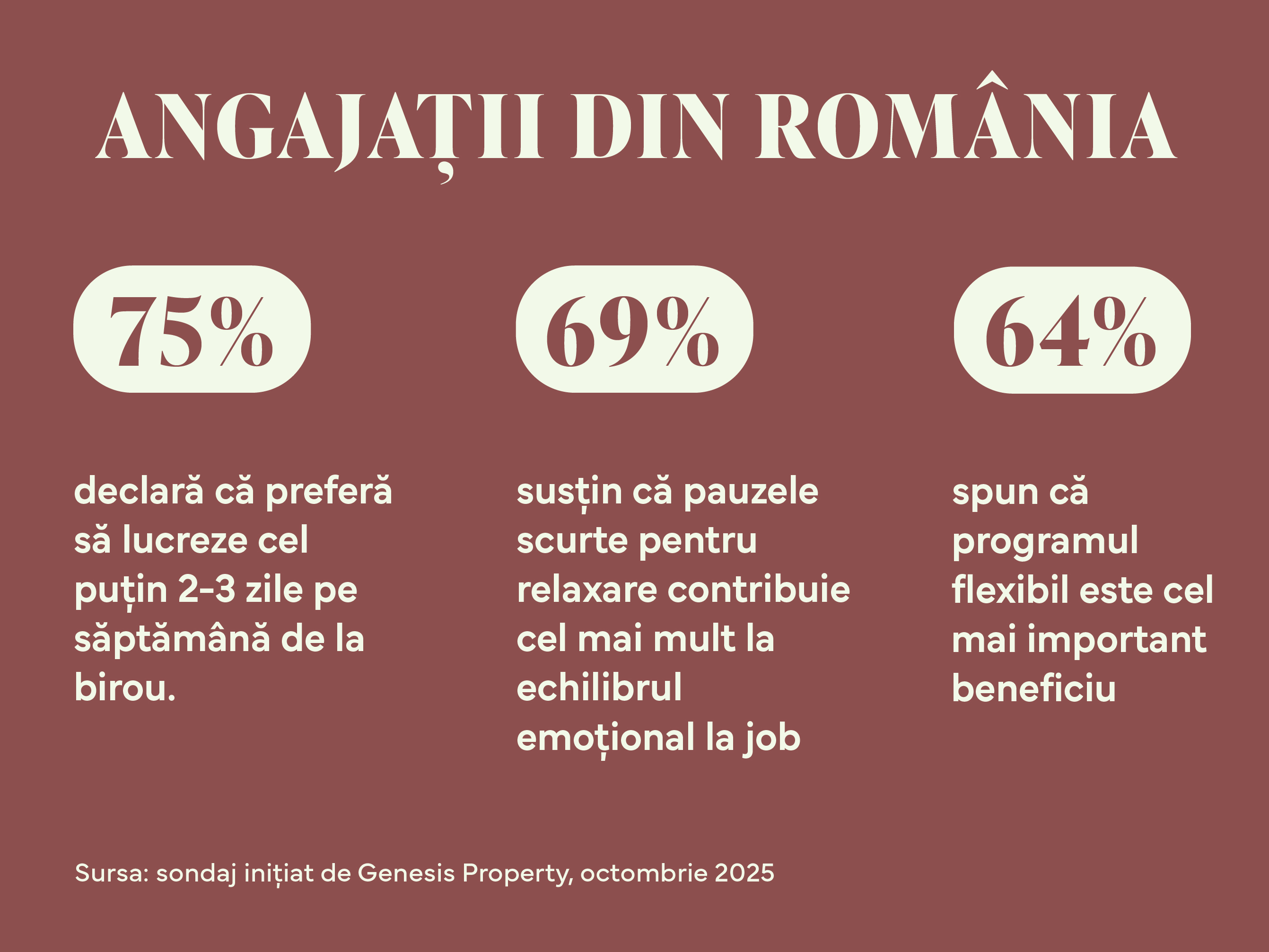 Sondajul, realizat de Genesis Property, a analizat modul în care se desfășoară viața la birou în actualul context socio-economic și cum este perceput rolul biroului de către angajați. Sondajul a fost desfășurat în octombrie 2025, la nivel național, prin platforma iVox, pe un eșantion total de 1.025 utilizatori de internet din România. Aproape 47% dintre participanți sunt de sex feminin, iar peste 53% au un venit net de cel puțin 5.000 de lei.
