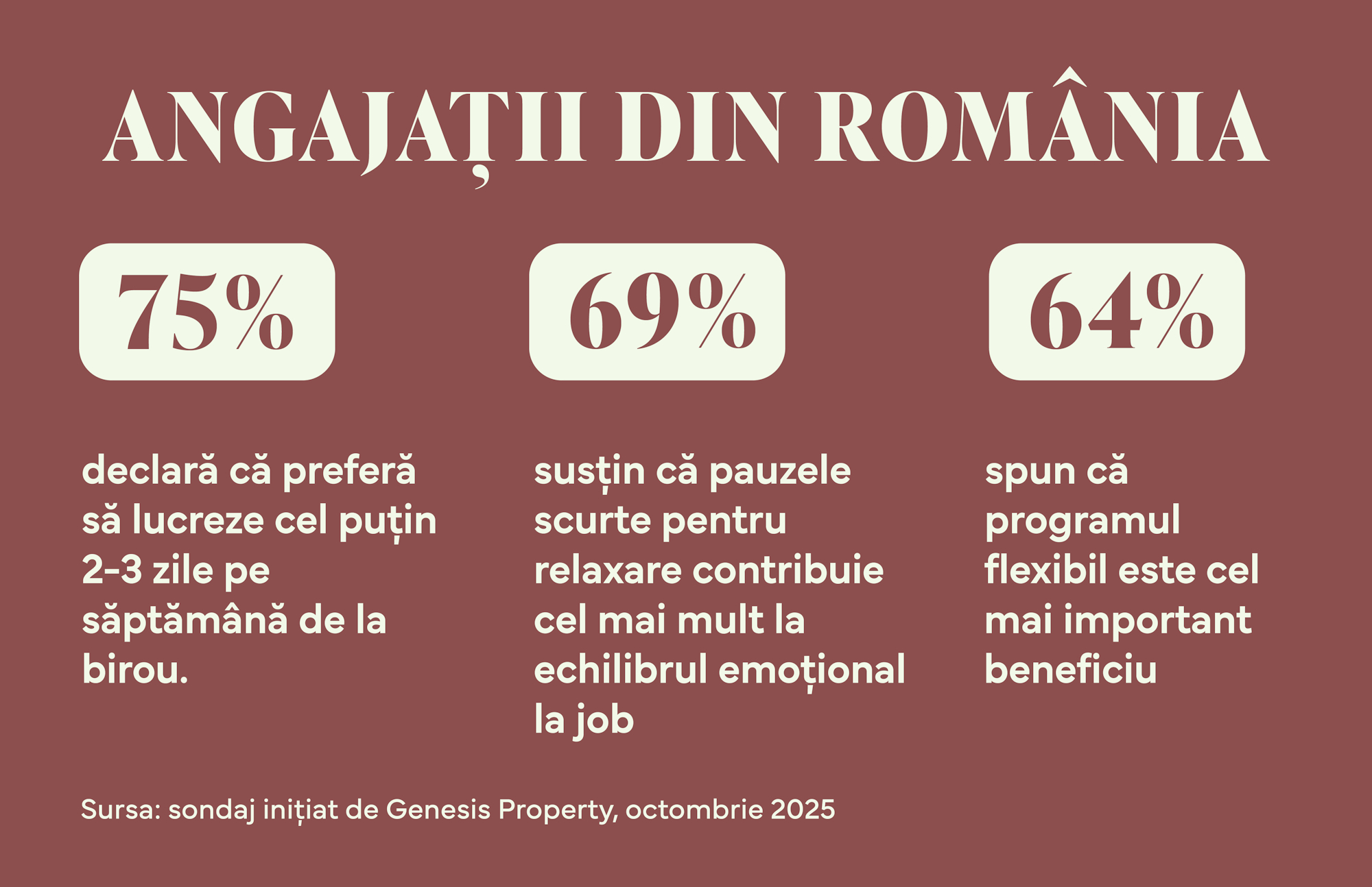 Sondajul, realizat de Genesis Property, a analizat modul în care se desfășoară viața la birou în actualul context socio-economic și cum este perceput rolul biroului de către angajați. Sondajul a fost desfășurat în octombrie 2025, la nivel național, prin platforma iVox, pe un eșantion total de 1.025 utilizatori de internet din România. Aproape 47% dintre participanți sunt de sex feminin, iar peste 53% au un venit net de cel puțin 5.000 de lei.
